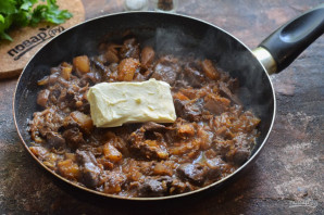 Добавьте печень к тыкве, жарьте еще 7-8 минут, после подлейте немного воды или бульона — 70 мл., тушите без крышки 10-15 минут. В конце приготовления добавьте соль, перец, масло. Масло должно просто растаять.