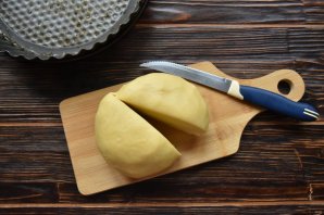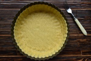 Достаньте из холодильника часть теста и раскатайте его в пласт, толщиной 0,5-0,7 мм. Перенесите тесто в форму для выпекания и распределите по дну и бортам. Наколите тесто вилкой, чтобы избежать деформации при выпекании.