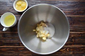 Масло натрите на терке или нарежьте мелким кубиком. Всыпьте 50 граммов сахара, соль, ванильный сахар.