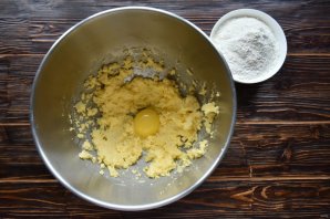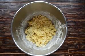 Когда мука впитает в себя влагу, разотрите тесто лопаткой до состояния крошки. Выложите заготовку песочного теста на столешницу и соберите крошку в шар.