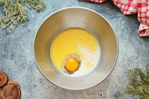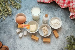 В миску влейте теплое молоко, растопленное масло и разбейте яйцо. Всыпьте в миску сахар, соль, раскрошите дрожжи и всыпьте ванильный сахар. Все хорошо перемешайте до растворения и однородности.