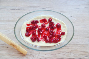 Достаньте тесто из миски, обомните и разделите на две неравные части. Большую часть раскатайте в пласт и выложите в форму для выпекания.