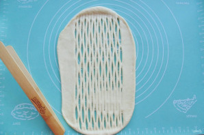 Вторую часть теста тоже раскатайте и с помощью специального валика или ножа сделайте надрезы на тесте.