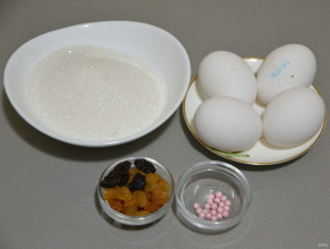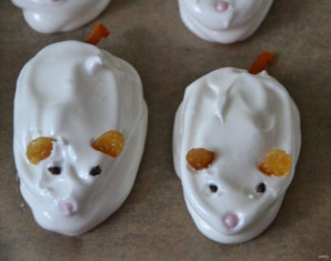 "Носик" сделайте из сахарной посыпки в форме розовых шариков, "ушки" сделайте из белого изюма, слегка расплющив его между пальцев, "глазки" сделайте из маленьких кусочков темного изюма, а "хвостики" из полосок кураги.