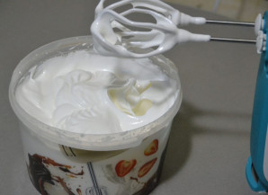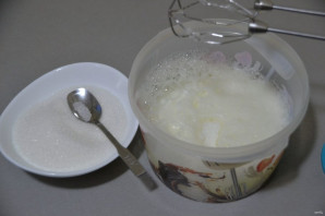 Продолжая взбивать, добавляйте по 1 чайной ложке сахара.