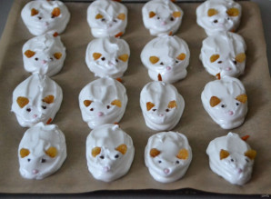 Застелите противень бумагой для выпечки, с помощью кондитерского мешка отсадите безе в форме "мышек".