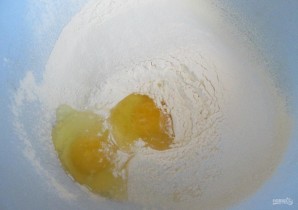 2. В миску просеиваю половину муки, по центру делаю углубление и вбиваю два куриных яйца.