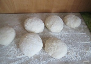 6. Через 30 минут разделяю тесто на несколько частей, сминаю в несколько комов и снова оставляю их на 20 минут.