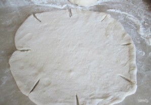 7. Насыпаю немного муки на стол и выкладываю одну часть, тонко раскатываю в круг и делаю надрезы по всему периметру.
