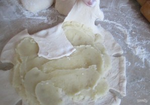 8. Несколько ложек ранее приготовленного картофельного пюре выкладываю по центру лепешки и размазываю, затем оттягиваю каждый край и загибаю к центру.