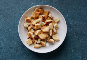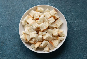 Батон нарежьте ножницами на маленькие квадратики.