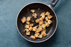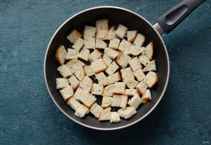 Обжарьте хлеб на сухой сковороде, периодически помешивая.