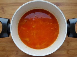 Добавьте процеженный овощной бульон. Доведите до кипения.