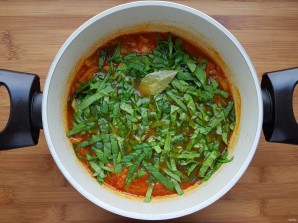 Добавьте шпинат и лавровый лист в похлебку. Варите еще 5 минут.