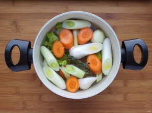 За 20 минут до готовности нута приготовьте овощной бульон. Для этого очистите и крупно нарежьте лук порей, сельдерей, морковь. Репчатый лук нарезать не надо. Залейте овощи 1 литром холодной воды и поставьте на огонь. Когда вода закипит, добавьте черный перец горошком и 2 веточки тимьяна. Варите 20 минут. Готовый бульон процедите через сито.