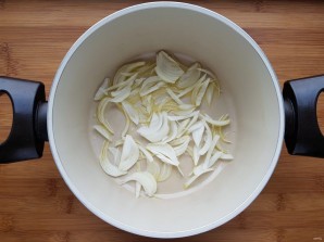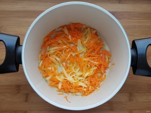 В кастрюле разогрейте масло и обжарьте в течение 1 минуты репчатый лук.