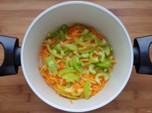 Через 1 минуту добавьте нарезанный болгарский перец. Пассеруйте все вместе еще 3 минуты.