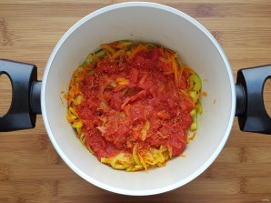 Затем добавьте нарезанные помидоры вместе с соком и паприку. Готовьте еще 5 минут.