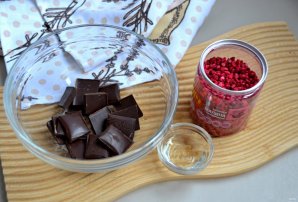Подготовки ингредиенты для окончательного декора эклеров — темный шоколад, 1 ч.л. растительного масла, опционально можно взять сублимированные ягоды (малину).