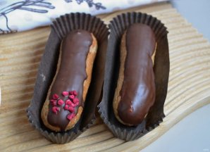 Окуните верхнюю часть эклера в шоколадную глазурь, декорируйте сублимированными ягодами. Выложите на решетку для стабилизации шоколада.