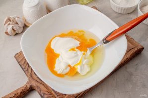 Добавьте сметану, соль. Тщательно перемешайте вилкой или венчиком.