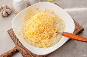 Сыр натрите на терке, добавьте к тесту и перемешайте. Тесто получается чуть гуще, чем на оладьи.