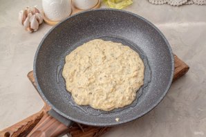 Сковороду смажьте кисточкой растительным маслом. Ложкой выложите примерно 1/3 часть теста, тыльной стороной ложки разровняйте его.