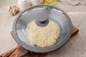 Жарьте при небольшом нагреве под крышкой с одной стороны 3-4 минуты.