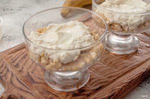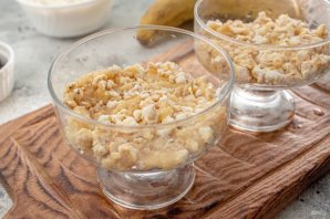 В креманки или стаканы выложите первым слоем часть массы из хлебцев и банана.