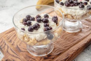 Повторите слои, поверх украсьте ягодами, рублеными орехами и мятой. Можно подавать сразу или охлажденным.