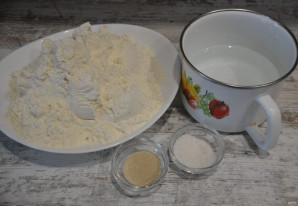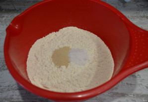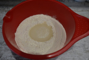 Сделайте в муке углубление и влейте в него воду температурой 27 градусов.