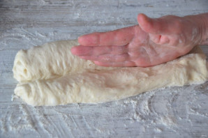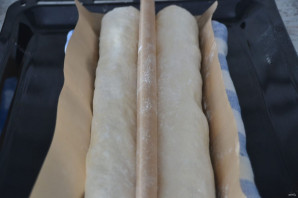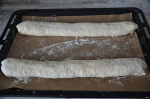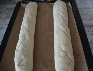 Хорошо защипните последний оборот, растяните багет по длине противня. Уложите на "шов" на расстоянии друг от друга.