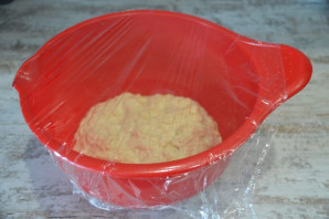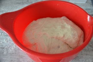 Замесите тесто. Очень хорошо это делать с помощью пластиковой лопаточкой для работы с тестом, круговыми движениями. Сполосните миску для расстойки теста, смажьте поверхность небольшим количеством растительного масла, чтобы тесту при подъеме ничто не мешало. Накройте тесто пищевой пленкой, поставьте в теплое место на 40 минут.