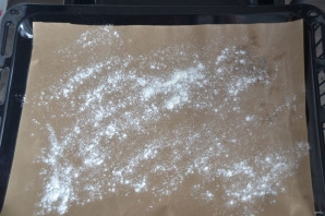 Подготовьте противень, застелите его пекарской бумагой или силиконовым ковриком, присыпьте слегка мукой.
