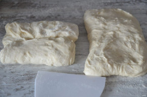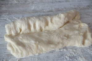 Разделите тесто на 2 части, разровняйте в пласт, сверните концы к центру, прикройте пленкой на 10 минут.
