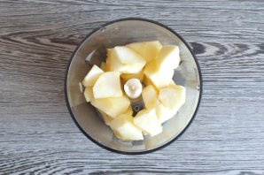 Яблоки очистите от кожуры и семенной коробочки. Нарежьте и переложите в чашу блендера. Добавьте воду.