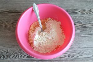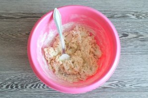 Начните замешивать тесто помощью ложки. Как только оно начнет собираться в комочки, месите руками.