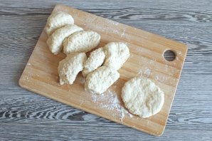 Готовое тесто должно получиться мягким, хорошо держать форму, но не быть забитым мукой. Долго не месите его. Как только образовался однородный комок, скатайте из него валик и поделите его на 8 равных частей. Подпылите мукой рабочую поверхность. Каждую часть разомните в круглую лепешку толщиной не более 1 см.