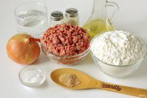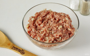 Для начинки соедините фарш и нарезанный мелкими кубиками лук. Добавьте холодную воду для сочности, соль и перец по вкусу. Все хорошо перемешайте.