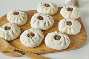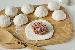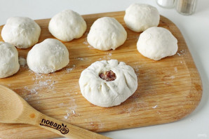 Затем поочередно раскатайте каждый колобочек в форме круга и положите по центру начинку.