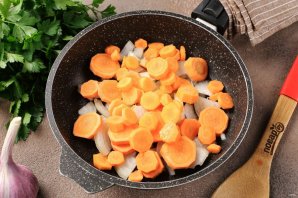 Разогрейте сковороду с маслом. Выложите нарезанные произвольно лук и морковь. Нарезка может быть любая на ваше усмотрение.