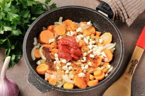 Обжарьте овощи до мягкости. Добавьте нарезанный кубиками чеснок, томатную пасту и специи. У меня паприка, кориандр, тимьян, майоран и молотый чёрный перец. Добавьте так же соль по вкусу. Перемешайте и готовьте ещё 2-3 минуты.