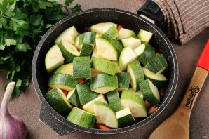 Затем добавьте нарезанный кабачок. Если шкурка мягкая и нежная, то её срезать не нужно, так же как и удалять семечки. Нарезать кабачки рекомендую не слишком мелко, чтобы они в процессе тушения не превратились в кашу и сохранили свою целостность.