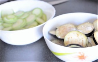 1. Нарежьте кружочками баклажаны и кабачки. Посолите их. Нарежьте кружочками помидоры, а сыр нарежьте тонкими пластинками.