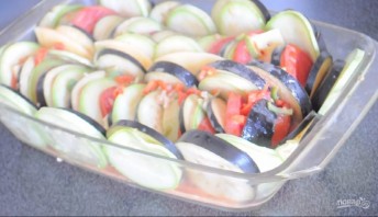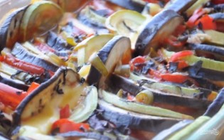 2. Выложите в форму для запекания поочередно баклажаны, кабачки, сыр и помидоры, формируя рататуй. Свободное место в форме заполните оставшимися овощами.