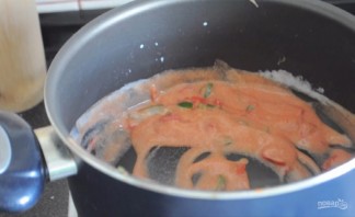 3. Приготовьте соус. Для этого мелко нарежьте перец чили и базилик. Сотейник поставьте на огонь и смешайте в нем кетчуп со сливки, перемешайте. Затем добавьте чили, немного воды и чеснок. Доведите до кипения.