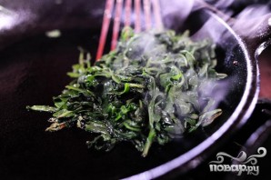 2. В сковороде на среднем огне нагреть оливковое масло и обжарить рукколу около 30-45 секунд. Убрать из сковороды и нарезать.