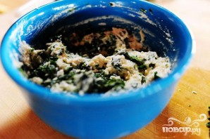 1. Смешать сыр рикотта, тертый Пармезан, 1 яйцо, соль и перец по вкусу. Выложить смесь в две миски и отложить в сторону.