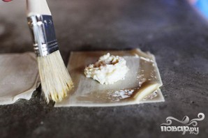 4. В небольшой миске взбить вместе 1 яйцо и 3 столовые ложки воды. Отставить в сторону. Довести воду в кастрюле до кипения. Сделать равиоли. Положить одну обертку на рабочую поверхность и выложить в центр от 1/2 до 1 чайной ложки начинки. С помощью кисти смазать края яичной смесью.