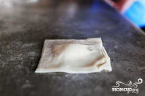 5. Накрыть сверху второй оберткой. Осторожно прижать, чтобы удалить пузырьки воздуха. Закрепить края. Отложить в сторону и повторить с оставшимися равиоли и начинкой.